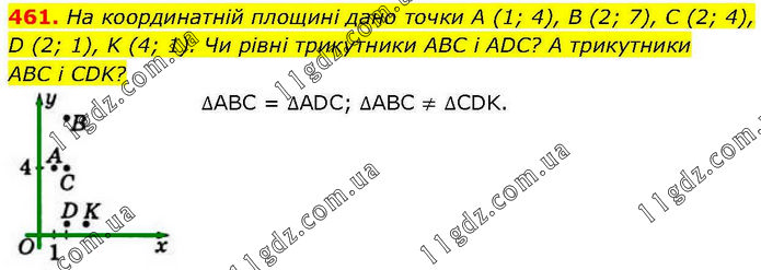 Нa координатній площині дано точки А (1; 4), В (2; 7), C (2; 4), D (2; 1), K (4; 1). Чи рівні трикутники ABC і ADC? А трикутники ABC і CDK? ∆АВС = ∆ADC; ∆ABC ≠ ∆CDK.