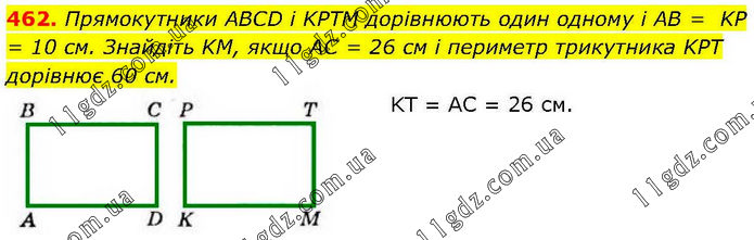 Прямокутники ABCD і KPTM дорівнюють один одному і AB = KP = 10 см. Знайдіть KM, якщо AC = 26 см і периметр трикутника KPT дорівнює 60 см. KT = AC = 26 см.