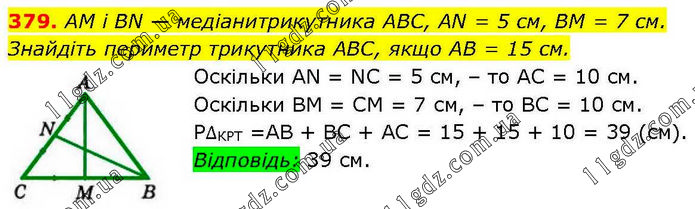 AМ і BN — медіанитрикутника АВС, AN = 5 см, BM = 7 см. Знайдіть периметр трикутника ABC, якщо AB = 15 см. Оскільки AN = NC = 5 см, – то АС = 10 см. Оскільки ВМ = СМ = 7 см, – то ВС = 10 см. Р∆КРТ =АВ + ВС + АС = 15 + 15 + 10 = 39 (см). Відповідь: 39 см.