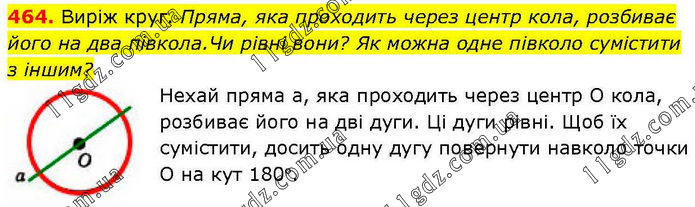 Виріж круг. Пряма, яка проходить через центр кола, розбиває його на два півкола.Чи рівні вони? Як можна одне півколо сумістити з іншим? Нехай пряма а, яка проходить через центр О кола, розбиває його на дві дуги. Ці дуги рівні. Щоб їх сумістити, досить одну дугу повернути навколо точки О на кут 180°.
