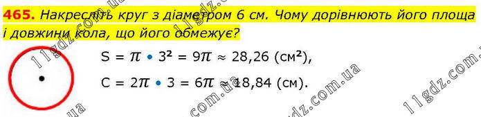 Накресліть круг з діаметром 6 см. Чому дорівнюють його площа і довжини кола, що його обмежує? S = π • 32 = 9π ≈ 28,26 (см2), С = 2π • 3 = 6π ≈ 18,84 (см).