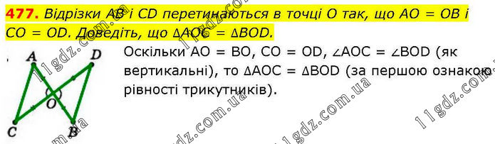 Відрізки AВ і CD перетинаються в точці O так, що AO = OB і CO = OD. Доведіть, що ∆АОС = ∆BOD. Оскільки АО = ВО, CO = OD, ∠AOC = ∠BOD (як вертикальні), то ∆АОС = ∆BOD (за першою ознакою рівності трикутників).