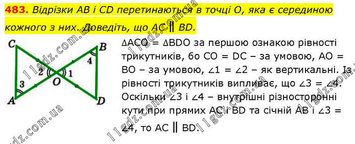 Відрізки AB і CD перетинаються в точці O, яка є серединою кожного з них. Доведіть, що AC ∥ BD. ∆ACO = ∆BDO за першою ознакою рівності трикутників, бо СО = DC – за умовою, АО = ВО – за умовою, ∠1 = ∠2 – як вертикальні. Із рівності трикутників випливає, що ∠3 = ∠4. Оскільки ∠3 і ∠4 – внутрішні різносторонні кути при прямих АС і BD та січній АВ і ∠3 = ∠4, то АС ∥ BD.
