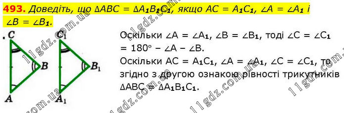 Доведіть, що ∆АВС = ∆A1B1C1, якщо AC = A1C1, ∠A = ∠A1 і ∠B = ∠B1. Оскільки ∠А = ∠А1, ∠В = ∠В1, тоді ∠С = ∠С1 = 180° – ∠А – ∠В. Оскільки АС = А1С1, ∠А = ∠А1, ∠С = ∠С1, то згідно з другою ознакою рівності трикутників ∆АВС = ∆А1В1С1.