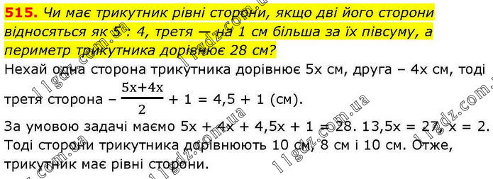 Чи має трикутник рівні сторони, якщо дві його сторони відносяться як 5 : 4, третя — на 1 см більша за їх півсуму, а периметр трикутника дорівнює 28 см? Нехай одна сторона трикутника дорівнює 5х см, друга – 4х см, тоді третя сторона – (5х+4х)/2 + 1 = 4,5 + 1 (см). За умовою задачі маємо 5х + 4х + 4,5х + 1 = 28. 13,5х = 27, х = 2. Тоді сторони трикутника дорівнюють 10 см, 8 см і 10 см. Отже, трикутник має рівні сторони.