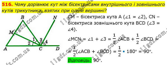 Чому дорівнює кут між бісектрисами внутрішнього і зовнішнього кутів трикутника, взятих при одній вершині? СМ – бісектриса кута А (∠1 = ∠2), CN – бісектриса зовнішнього кута BCD (∠3 = ∠4). ∠MCN = ∠1 + ∠3 = 1/2∠ACB + 1/2∠BCD = 1/2(∠ACB + ∠BCD) = 1/2 • 180° = 90°. Відповідь: 90°.