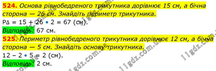 524. Основа рівнобедреного трикутника дорівнює 15 см, а бічна сторона — 26 см. Знайдіть периметр трикутника. Р∆ = 15 + 26 • 2 = 67 (см). Відповідь: 67 см. 525. Периметр рівнобедреного трикутника дорівнює 12 см, а бічна сторона — 5 см. Знайдіть основу трикутника. 12 – 2 • 5 = 2 (см). Відповідь: 2 см.