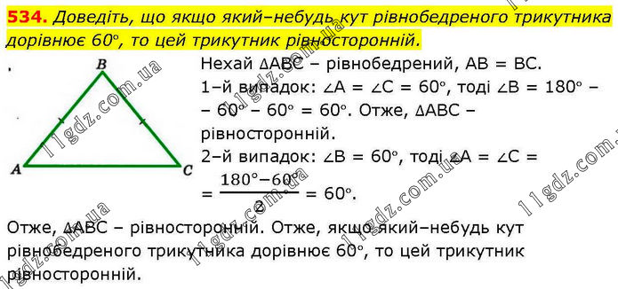 Доведіть, що якщо який–небудь кут рівнобедреного трикутника дорівнює 60°, то цей трикутник рівносторонній. Нехай ∆АВС – рівнобедрений, АВ = ВС. 1–й випадок: ∠А = ∠С = 60°, тоді ∠В = 180° – – 60° – 60° = 60°. Отже, ∆АВС – рівносторонній. 2–й випадок: ∠В = 60°, тоді ∠А = ∠С = (180°-60°)/2 = 60°. Отже, ∆АВС – рівносторонній. Отже, якщо який–небудь кут рівнобедреного трикутника дорівнює 60°, то цей трикутник рівносторонній.