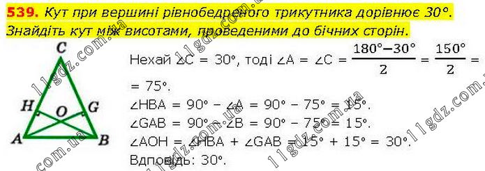 Кут при вершині рівнобедреного трикутника дорівнює 30°. Знайдіть кут між висотами, проведеними до бічних сторін. Нехай ∠С = 30°, тоді ∠А = ∠С = (180°-30°)/2 = (150°)/2 = = 75°. ∠НВА = 90° – ∠А = 90° – 75° = 15°. ∠GAB = 90° – ∠B = 90° – 75° = 15°. ∠AOH = ∠HBA + ∠GAB = 15° + 15° = 30°. Вдповідь: 30°.