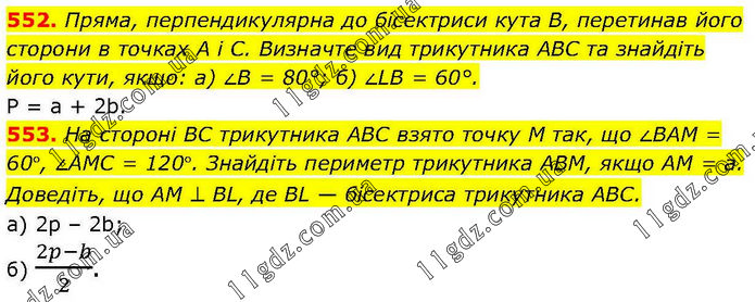552. Пряма, перпендикулярна до бісектриси кута В, перетинав його сторони в точках А і С. Визначте вид трикутника ABC та знайдіть його кути, якщо: a) ∠B = 80°; б) ∠LB = 60°. Р = а + 2b. 553. Нa стороні BC трикутника ABC взято точку M так, що ∠BAМ = 60°, ∠AMC = 120°. Знайдіть периметр трикутника ABM, якщо AM = а. Доведіть, що AМ ⊥ BL, де BL — бісектриса трикутника ABC. a) 2p – 2b; б) (2p-b)/2.