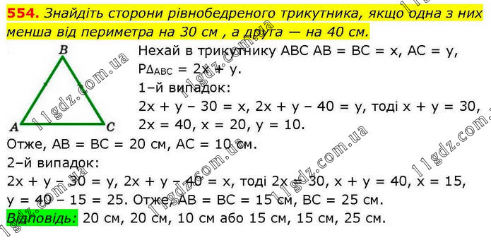 Знайдіть сторони рівнобедреного трикутника, якщо одна з них менша від периметра на 30 см , а друга — на 40 см. Нехай в трикутнику АВС АВ = ВС = х, АС = у, Р∆АВС = 2х + у. 1–й випадок: 2х + у – 30 = х, 2х + у – 40 = у, тоді х + у = 30, 2х = 40, х = 20, у = 10. Отже, АВ = ВС = 20 см, АС = 10 см. 2–й випадок: 2х + у – 30 = у, 2х + у – 40 = х, тоді 2х = 30, х + у = 40, х = 15, у = 40 – 15 = 25. Отже, АВ = ВС = 15 см, ВС = 25 см. Відповідь: 20 см, 20 см, 10 см або 15 см, 15 см, 25 см.