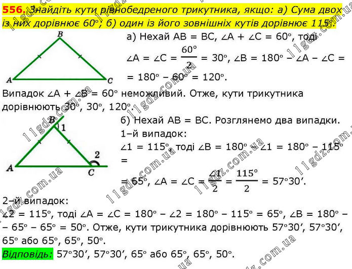 Знайдіть кути рівнобедреного трикутника, якщо: а) Cумa двох із них дорівнює 60°; б) один із його зовнішніх кутів дорівнює 115°. а) Нехай АВ = ВС, ∠А + ∠С = 60°, тоді ∠А = ∠С = (60°)/2 = 30°, ∠В = 180° – ∠А – ∠С = 180° – 60° = 120°. Випадок ∠А + ∠В = 60° неможливий. Отже, кути трикутника дорівнюють 30°, 30°, 120°. б) Нехай АВ = ВС. Розглянемо два випадки. 1–й випадок: ∠1 = 115°, тоді ∠В = 180° – ∠1 = 180° – 115° = 65°, ∠А = ∠С = (∠1)/2 = (115°)/2 = 57°30’. 2–й випадок: ∠2 = 115°, тоді ∠А = ∠С = 180° – ∠2 = 180° – 115° = 65°, ∠В = 180° – 65° – 65° = 50°. Отже, кути трикутника дорівнюють 57°30’, 57°30’, 65° або 65°, 65°, 50°. Відповідь: 57°30’, 57°30’, 65° або 65°, 65°, 50°.