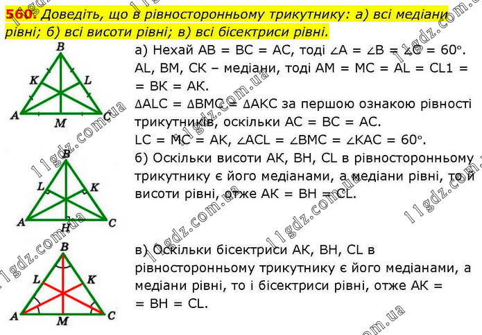 Доведіть, що в рівносторонньому трикутнику: а) всі медіани рівні; б) всі висоти рівні; в) всі бісектриси рівні. а) Нехай АВ = ВС = АС, тоді ∠А = ∠В = ∠С = 60°. AL, ВМ, СК – медіани, тоді АМ = МС = АL = CL1 = ВК = АК. ∆ALC = ∆BMC = ∆AKC за першою ознакою рівності трикутників, оскільки АС = ВС = АС. LC = MC = AK, ∠ACL = ∠BMC = ∠KAC = 60°. б) Оскільки висоти АК, ВН, СL в рівносторонньому трикутнику є його медіанами, а медіани рівні, то й висоти рівні, отже АК = ВН = СL. в) Оскільки бісектриси АК, ВН, СL в рівносторонньому трикутнику є його медіанами, а медіани рівні, то і бісектриси рівні, отже АК = ВН = СL.