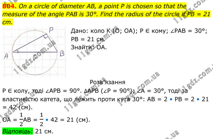 On a circle of diameter AB, a point P is chosen so that the measure of the angle РАВ is 30°. Find the radius of the circle if PB = 21 cm. Дано: коло К (О; ОА); Р ∈ кому; ∠РАВ = 30°; РВ = 21 см. Знайти: ОА. Розв’язання Р ∈ колу, тоді ∠АРВ = 90°. ∆АРВ (∠Р = 90°); ∠А = 30°, тоді за властивістю катета, що лежить проти кута 30°: АВ = 2 • РВ = 2 • 21 = 42 (см). ОА = 1/2АВ = 1/2 • 42 = 21 (см). Відповідь: 21 см.