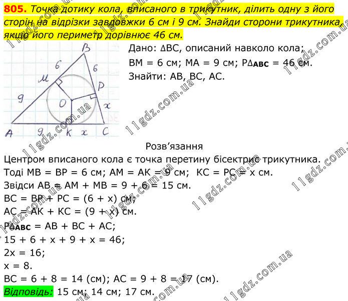 Точка дотику кола, вписаного в трикутник, ділить одну з його сторін на відрізки завдовжки 6 см і 9 см. Знайди сторони трикутника, якщо його периметр дорівнює 46 см. Дано: ∆ВС, описаний навколо кола; ВМ = 6 см; МА = 9 см; Р∆АВС = 46 см. Знайти: АВ, ВС, АС. Розв’язання Центром вписаного кола є точка перетину бісектрис трикутника. Тоді МВ = ВР = 6 см; АМ = АК = 9 см; КС = РС = х см. Звідси АВ = АМ + МВ = 9 + 6 = 15 см. ВС = ВР + РС = (6 + х) см; АС = АК + КС = (9 + х) см. Р∆АВС = АВ + ВС + АС; 15 + 6 + х + 9 + х = 46; 2х = 16; х = 8. ВС = 6 + 8 = 14 (см); АС = 9 + 8 = 17 (см). Відповідь: 15 см; 14 см; 17 см.