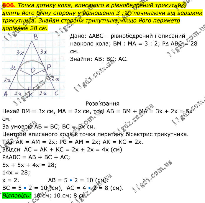 Точка дотику кола, вписаного в рівнобедрений трикутник, ділить його бічну сторону у відношенні 3 : 2, починаючи від вершини трикутника. Знайди сторони трикутника, якщо його периметр дорівнює 28 см. Дано: ∆АВС – рівнобедрений і описаний навколо кола; ВМ : МА = 3 : 2; Р∆ АВС = 28 см. Знайти: АВ; ВС; АС. Розв’язання Нехай ВМ = 3х см, МА = 2х см, тоді АВ = ВМ + МА = 3х + 2х = 5х см. За умовою АВ = ВС; ВС = 5х см. Центром вписаного кола є точка перетину бісектрис трикутника. Тоді АК = АМ = 2х; РС = АМ = 2х; АК = КС = 2х. Звідси АС = АК + КС = 2х + 2х = 4х (см). Р∆АВС = АВ + ВС + АС; 5х + 5х + 4х = 28; 14х = 28; х = 2. АВ = 5 • 2 = 10 (см). ВС = 5 • 2 = 10 (см), АС = 4 • 2 = 8 (см). Відповідь: 10 см; 10 см; 8 см.