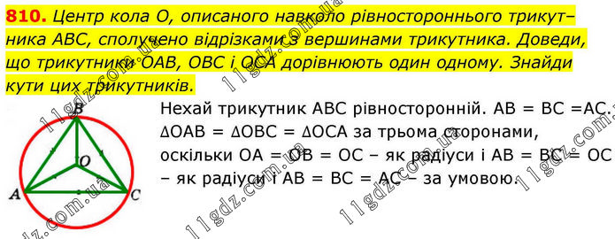 Центр кола O, описаного навколо рівностороннього трикут–ника ABC, сполучено відрізками з вершинами трикутника. Доведи, що трикутники OAB, OBC і OCA дорівнюють один одному. Знайди кути цих трикутників. Нехай трикутник АВС рівносторонній. АВ = ВС = АС. ∆ОАВ = ∆ОВС = ∆ОСА за трьома сторонами, оскільки ОА = ОВ = ОС – як радіуси і АВ = ВС = ОС – як радіуси і АВ = ВС = АС – за умовою.