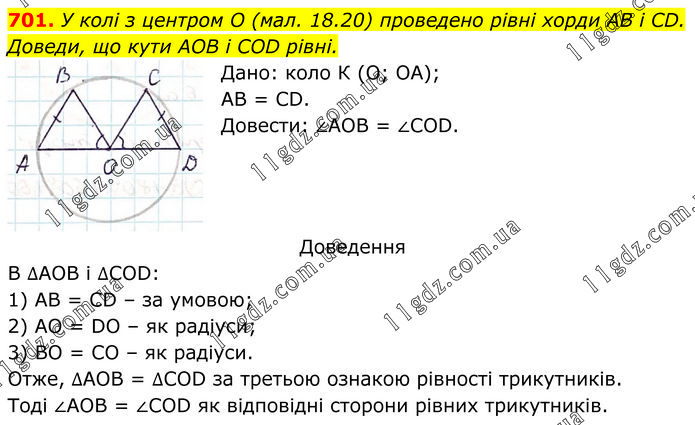 У колі з центром О (мал. 18.20) проведено рівні хорди АВ і СD. Доведи, що кути АОВ і CОD рівні. Дано: коло К (О; ОА); АВ = CD. Довести: ∠АОВ = ∠COD. Доведення В ∆АОВ і ∆СОD: 1) АВ = CD – за умовою; 2) АО = DO – як радіуси; 3) ВО = СО – як радіуси. Отже, ∆АОВ = ∆СОD за третьою ознакою рівності трикутників. Тоді ∠АОВ = ∠COD як відповідні сторони рівних трикутників.