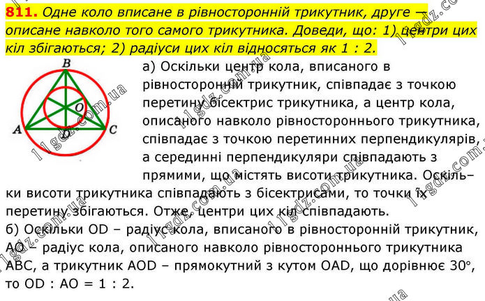 Одне коло вписане в рівносторонній трикутник, друге — описане навколо того самого трикутника. Доведи, що: 1) центри цих кіл збігаються; 2) радіуси цих кіл відносяться як 1 : 2. а) Оскільки центр кола, вписаного в рівносторонній трикутник, співпадає з точкою перетину бісектрис трикутника, а центр кола, описаного навколо рівностороннього трикутника, співпадає з точкою перетинних перпендикулярів, а серединні перпендикуляри співпадають з прямими, що містять висоти трикутника. Оскільки висоти трикутника співпадають з бісектрисами, то точки їх перетину збігаються. Отже, центри цих кіл співпадають. б) Оскільки OD – радіус кола, вписаного в рівносторонній трикутник, АО – радіус кола, описаного навколо рівностороннього трикутника АВС, а трикутник AOD – прямокутний з кутом OAD, що дорівнює 30°, то OD : AO = 1 : 2.