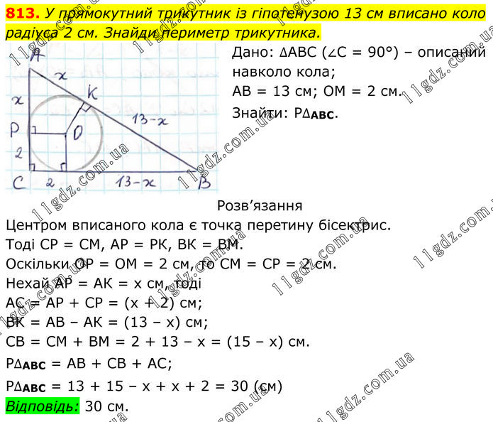 У прямокутний трикутник із гіпотенузою 13 см вписано коло радіуса 2 см. Знайди периметр трикутника. Дано: ∆АВС (∠С = 90°) – описаний навколо кола; АВ = 13 см; ОМ = 2 см. Знайти: Р∆АВС. Розв’язання Центром вписаного кола є точка перетину бісектрис. Тоді СР = СМ, АР = РК, ВК = ВМ. Оскільки ОР = ОМ = 2 см, то СМ = СР = 2 см. Нехай АР = АК = х см, тоді АС = АР + СР = (х + 2) см; ВК = АВ – АК = (13 – х) см; СВ = СМ + ВМ = 2 + 13 – х = (15 – х) см. Р∆АВС = АВ + СВ + АС; Р∆АВС = 13 + 15 – х + х + 2 = 30 (см). Відповідь: 30 см.