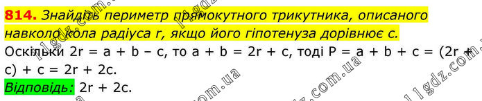 Знайдіть периметр прямокутного трикутника, описаного навколо кола радіуса r, якщо його гіпотенуза дорівнює c. Оскільки 2r = a + b – c, то a + b = 2r + c, тоді Р = a + b + c = (2r + c) + c = 2r + 2c. Відповідь: 2r + 2c.