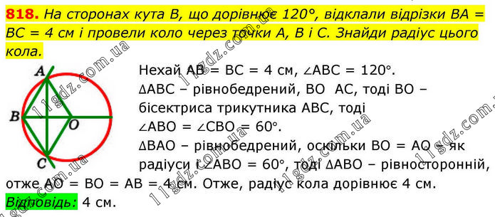 На сторонах кута B, що дорівнює 120°, відклали відрізки BA = BC = 4 см і провели коло через точки A, B і C. Знайди радіус цього кола. Нехай АВ = ВС = 4 см, ∠АВС = 120°. ∆АВС – рівнобедрений, ВО ⊥ АС, тоді ВО – бісектриса трикутника АВС, тоді ∠АВО = ∠СВО = 60°. ∆ВАО – рівнобедрений, оскільки ВО = АО – як радіуси і ∠АВО = 60°, тоді ∆АВО – рівносторонній, отже АО = ВО = АВ = 4 см. Отже, радіус кола дорівнює 4 см. Відповідь: 4 см.
