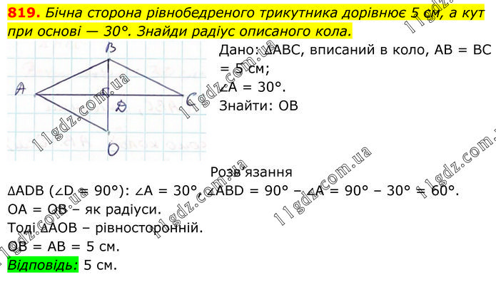 Бічна сторона рівнобедреного трикутника дорівнює 5 см, а кут при основі — 30°. Знайди радіус описаного кола. Дано: ∆АВС, вписаний в коло, АВ = ВС = 5 см; ∠А = 30°. Знайти: ОВ. Розв’язання ∆ADB (∠D = 90°): ∠A = 30°, ∠ABD = 90° – ∠A = 90° – 30° = 60°. ОА = ОВ – як радіуси. Тоді ∆АОВ – рівносторонній. ОВ = АВ = 5 см. Відповідь: 5 см.