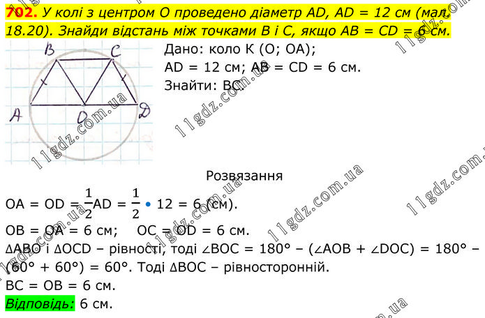 У колі з центром О проведено діаметр АD, АD = 12 см (мал. 18.20). Знайди відстань між точками В і С, якщо АВ = CD = 6 см. Дано: коло К (О; ОА); AD = 12 cм; АВ = CD = 6 см. Знайти: ВС. Розвязання ОА = ОD = 1/2AD = 1/2 • 12 = 6 (см). ОВ = ОА = 6 см; OC = OD = 6 см. ∆ABO і ∆OCD – рівності, тоді ∠ВОС = 180° – (∠АОВ + ∠DOC) = 180° – (60° + 60°) = 60°. Тоді ∆ВОС – рівносторонній. ВС = ОВ = 6 см. Відповідь: 6 см.
