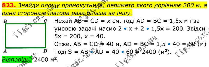 Знайди площу прямокутника, периметр якого дорівнює 200 м, а одна сторона в півтора раза більша за іншу. Нехай АВ = СD = х см, тоді AD = BC = 1,5x м і за умовою задачі маємо 2 • х + 2 • 1,5х = 200. Звідси 5х = 200, х = 40. Отже, АВ = CD = 40 м, AD = ВС = 1,5 • 40 = 60 (м). Тоді S = AB • AD = 40 • 60 = 2400 (м2). Відповідь: 2400 м2.