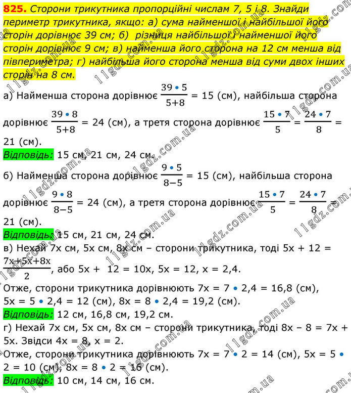 Сторони трикутника пропорційні числам 7, 5 і 8. Знайди периметр трикутника, якщо: а) сума найменшої і найбільшої його сторін дорівнює 39 см; б) різниця найбільшої і найменшої його сторін дорівнює 9 см; в) найменша його сторона на 12 см менша від півпериметра; г) найбільша його сторона менша від суми двох інших сторін на 8 см. а) Найменша сторона дорівнює (39 • 5)/( 5+8) = 15 (см), найбільша сторона дорівнює (39 • 8)/( 5+8) = 24 (см), а третя сторона дорівнює (15 • 7)/( 5) = (24 • 7)/( 8) = 21 (см). Відповідь: 15 см, 21 см, 24 см. б) Найменша сторона дорівнює (9 • 5)/( 8-5) = 15 (см), найбільша сторона дорівнює (9 • 8)/( 8-5) = 24 (см), а третя сторона дорівнює (15 • 7)/( 5) = (24 • 7)/( 8) = 21 (см). Відповідь: 15 см, 21 см, 24 см. в) Нехай 7х см, 5х см, 8х см – сторони трикутника, тоді 5х + 12 = (7х+5х+8х)/2, або 5х + 12 = 10х, 5х = 12, х = 2,4. Отже, сторони трикутника дорівнюють 7х = 7 • 2,4 = 16,8 (см), 5х = 5 • 2,4 = 12 (см), 8х = 8 • 2,4 = 19,2 (см). Відповідь: 12 см, 16,8 см, 19,2 см. г) Нехай 7х см, 5х см, 8х см – сторони трикутника, тоді 8х – 8 = 7х + 5х. Звідси 4х = 8, х = 2. Отже, сторони трикутника дорівнюють 7х = 7 • 2 = 14 (см), 5х = 5 • 2 = 10 (см), 8х = 8 • 2 = 16 (см). Відповідь: 10 см, 14 см, 16 см.