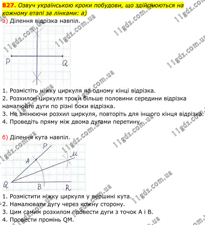 Озвуч українською кроки побудови, що здійснюються на кожному етапі за лінками: а) а) Ділення відрізка навпіл. 1. Розмістіть ніжку циркуля на одному кінці відрізка. 2. Розхилом циркуля трохи більше половини середини відрізка намалюйте дуги по різні боки відрізка. 3. Не змінюючи розхил циркуля, повторіть для іншого кінця відрізка. 4. Проведіть пряму між двома дугами перетину. б) Ділення кута навпіл. 1. Розмістити ніжку циркуля у вершині кута. 2. Намалювати дугу через кожну сторону. 3. Цим самим розхилом провести дуги з точок А і В. 4. Провести промінь QM.