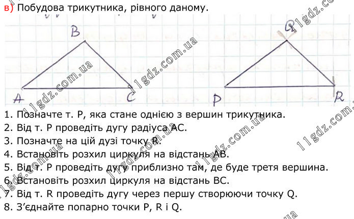 Побудова трикутника, рівного даному. 1. Позначте т. Р, яка стане однією з вершин трикутника. 2. Від т. Р проведіть дугу радіуса АС. 3. Позначте на цій дузі точку R. 4. Встановіть розхил циркуля на відстань АВ. 5. Від т. Р проведіть дугу приблизно там, де буде третя вершина. 6. Встановіть розхил циркуля на відстань ВС. 7. Від т. R проведіть дугу через першу створюючи точку Q. 8. З’єднайте попарно точки P, R i Q.
