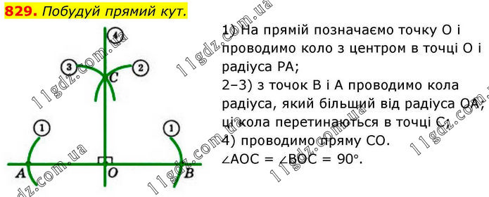 Побудуй прямий кут. 1) На прямій позначаємо точку О і проводимо коло з центром в точці О і радіуса РА; 2–3) з точок В і А проводимо кола радіуса, який більший від радіуса ОА; ці кола перетинаються в точці С; 4) проводимо пряму СО. ∠АОС = ∠ВОС = 90°.