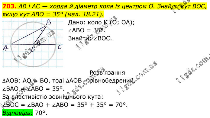 АВ і АС — хорда й діаметр кола із центром О. Знайди кут ВОС, якщо кут АВО = 35° (мал. 18.21). Дано: коло К (О; ОА); ∠АВО = 35°. Знайти: ∠ВОС. Розв’язання ∆АОВ: АО = ВО, тоді ∆АОВ – рівнобедрений. ∠ВАО = ∠АВО = 35°. За властивістю зовнішнього кута: ∠ВОС = ∠ВАО + ∠АВО = 35° + 35° = 70°. Відповідь: 70°.