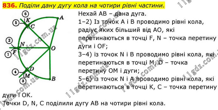 Поділи дану дугу кола на чотири рівні частини. Нехай АВ – дана дуга. 1–2) Із точок А і В проводимо рівні кола, радіус яких більший від АО, які перетинаються в точці F, N – точка перетину дуги і OF; 3–4) із точок N і В проводимо рівні кола, які перетинаються в точці М, D – точка перетину ОМ і дуги; 5–6) із точок N і А проводимо рівні кола, які перетинаються в точці К, С – точка перетину дуги і ОК. Точки D, N, C поділили дугу АВ на чотири рівні кола.