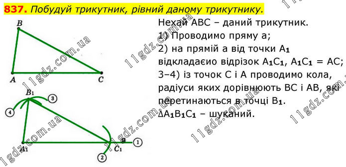 Побудуй трикутник, рівний даному трикутнику. Нехай АВС – даний трикутник. 1) Проводимо пряму а; 2) на прямій а від точки А1 відкладаєио відрізок А1С1, А1С1 = АС; 3–4) із точок С і А проводимо кола, радіуси яких дорівнюють ВС і АВ, які перетинаються в точці В1. ∆А1В1С1 – шуканий.
