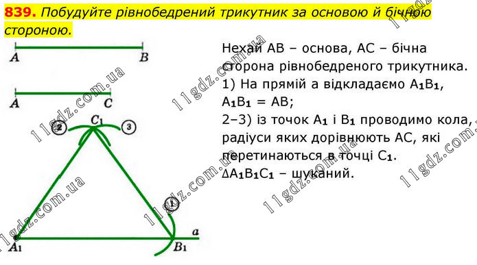 Побудуйте рівнобедрений трикутник за основою й бічною стороною. Нехай АВ – основа, АС – бічна сторона рівнобедреного трикутника. 1) На прямій а відкладаємо А1В1, А1В1 = АВ; 2–3) із точок А1 і В1 проводимо кола, радіуси яких дорівнюють АС, які перетинаються в точці С1. ∆А1В1С1 – шуканий.