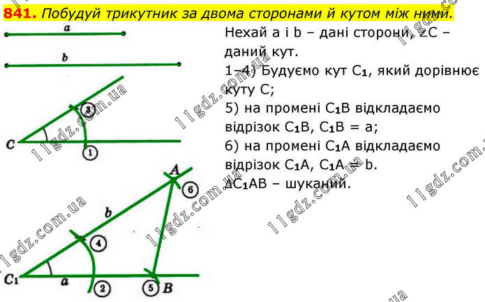 Побудуй трикутник за двома сторонами й кутом між ними. Нехай а і b – дані сторони, ∠С – даний кут. 1–4) Будуємо кут С1, який дорівнює куту С; 5) на промені С1В відкладаємо відрізок С1В, С1В = а; 6) на промені С1А відкладаємо відрізок С1А, С1А = b. ∆C1AB – шуканий.