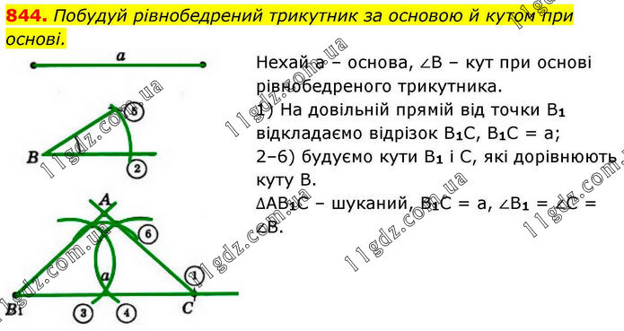 Побудуй рівнобедрений трикутник за основою й кутом при основі. Нехай а – основа, ∠В – кут при основі рівнобедреного трикутника. 1) На довільній прямій від точки В1 відкладаємо відрізок В1С, В1С = а; 2–6) будуємо кути В1 і С, які дорівнюють куту В. ∆АВ1С – шуканий, В1С = а, ∠В1 = ∠С = ∠В.