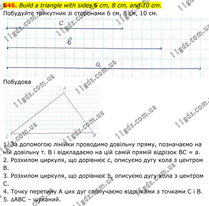 Build a triangle with sides 6 cm, 8 cm, and 10 cm. Побудуйте трикутник зі сторонами 6 см, 8 см, 10 см. Побудова 1. За допомогою лінійки проводимо довільну пряму, позначаємо на ній довільну т. В і відкладаємо на цій самій прямій відрізок ВС = а. 2. Розхилом циркуля, що дорівнює с, описуємо дугу кола з центром В. 3. Розхилом циркуля, що дорівнює b, описуємо дугу кола з центром С. 4. Точку перетину А цих дуг сполучаємо відрізками з точками С і В. 5. ∆АВС – шуканий.