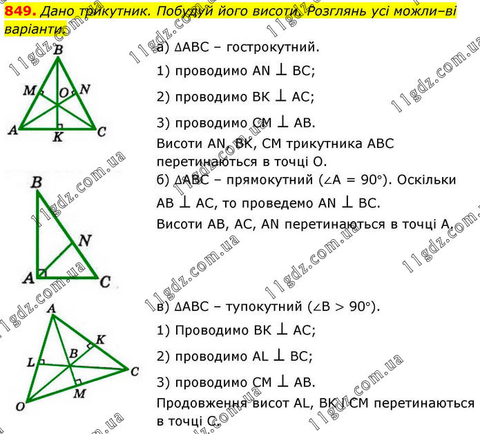 Дано трикутник. Побудуй його висоти. Розглянь усі можливі варіанти. а) ∆АВС – гострокутний. 1) проводимо AN ⊥ BC; 2) проводимо ВК ⊥ АС; 3) проводимо СМ ⊥ АВ. Висоти AN, BK, CM трикутника АВС перетинаються в точці О. б) ∆АВС – прямокутний (∠А = 90°). Оскільки АВ ⊥ АС, то проведемо AN ⊥ BC. Висоти АВ, АС, АN перетинаються в точці А. в) ∆АВС – тупокутний (∠В > 90°). 1) Проводимо ВК ⊥ АС; 2) проводимо AL ⊥ BC; 3) проводимо СМ ⊥ АВ. Продовження висот AL, BK i CM перетинаються в точці С.