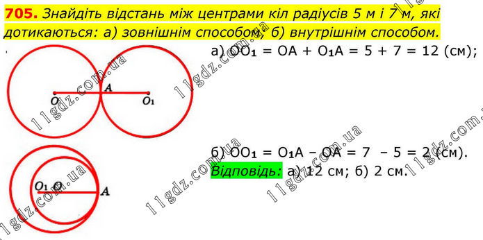 Знайдіть відстань між центрами кіл радіусів 5 м і 7 м, які дотикаються: а) зовнішнім способом; б) внутрішнім способом. а) ОО1 = ОА + О1А = 5 + 7 = 12 (см); б) ОО1 = О1А – ОА = 7 – 5 = 2 (см). Відповідь: а) 12 см; б) 2 см.