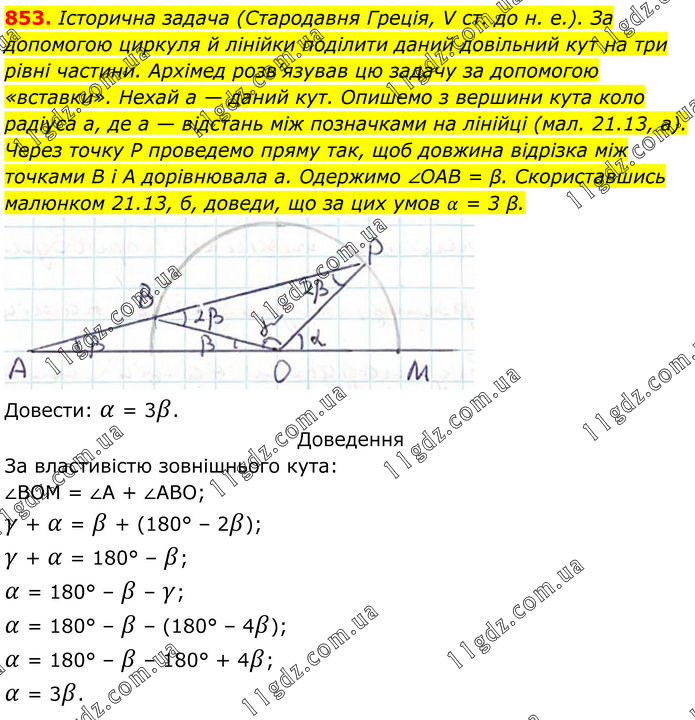 Історична задача (Стародавня Греція, V ст. до н. е.). За допомогою циркуля й лінійки поділити даний довільний кут на три рівні частини. Архімед розв’язував цю задачу за допомогою «вставки». Нехай a — даний кут. Опишемо з вершини кута коло радіуса a, де a — відстань між позначками на лінійці (мал. 21.13, а). Через точку P проведемо пряму так, щоб довжина відрізка між точками B і A дорівнювала a. Одержимо ∠OAB = β. Скориставшись малюнком 21.13, б, доведи, що за цих умов α = 3β. Довести: α = 3β. Доведення За властивістю зовнішнього кута: ∠ВОМ = ∠А + ∠АВО; γ + α = β + (180° – 2β); γ + α = 180° – β; α = 180° – β – γ; α = 180° – β – (180° – 4β); α = 180° – β – 180° + 4β; α = 3β.
