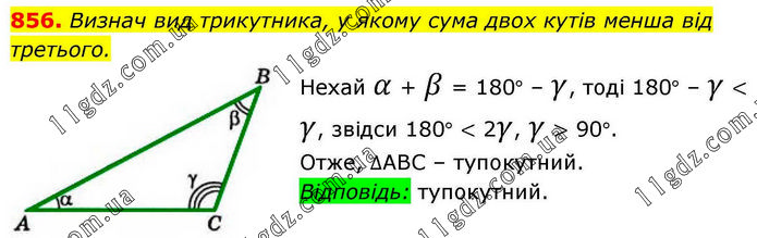 Визнач вид трикутника, у якому сума двох кутів менша від третього. Нехай α + β = 180° – γ, тоді 180° – γ < γ, звідси 180° < 2γ, γ > 90°. Отже, ∆АВС – тупокутний. Відповідь: тупокутний.