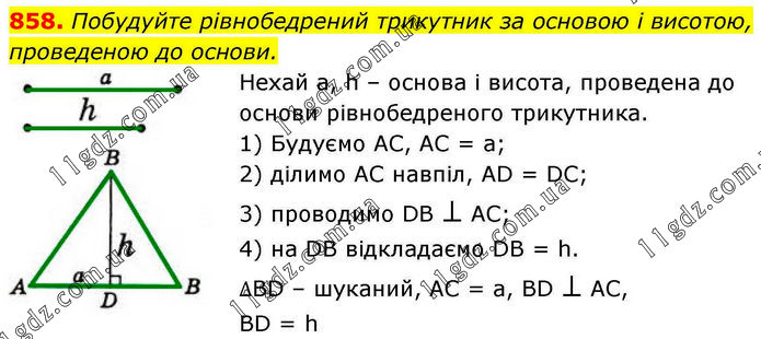 Побудуйте рівнобедрений трикутник за основою і висотою, проведеною до основи. Нехай а, h – основа і висота, проведена до основи рівнобедреного трикутника. 1) Будуємо АС, АС = а; 2) ділимо АС навпіл, AD = DC; 3) проводимо DB ⊥ AC; 4) на DB відкладаємо DB = h. ∆BD – шуканий, АС = а, BD ⊥ АС, BD = h.