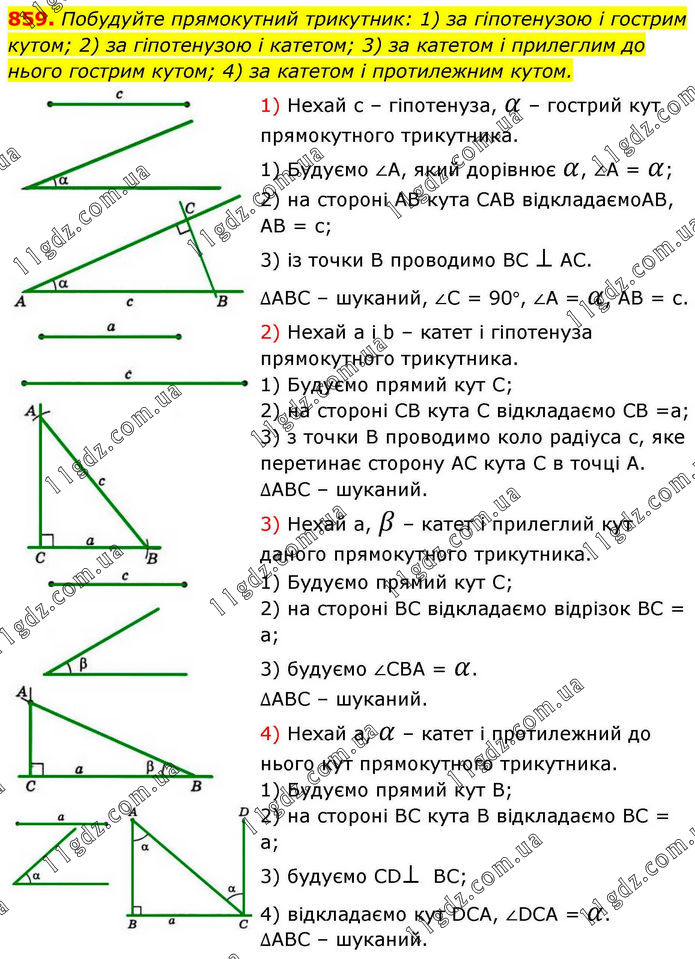 Побудуйте прямокутний трикутник: 1) за гіпотенузою і гострим кутом; 2) за гіпотенузою і катетом; 3) за катетом і прилеглим до нього гострим кутом; 4) за катетом і протилежним кутом. 1) Нехай с – гіпотенуза, α – гострий кут прямокутного трикутника. 1) Будуємо ∠А, який дорівнює α, ∠А = α; 2) на стороні АВ кута САВ відкладаємоАВ, АВ = с; 3) із точки В проводимо ВС ⊥ АС. ∆АВС – шуканий, ∠С = 90°, ∠А = α, АВ = с. 2) Нехай а і b – катет і гіпотенуза прямокутного трикутника. 1) Будуємо прямий кут С; 2) на стороні СВ кута С відкладаємо СВ =а; 3) з точки В проводимо коло радіуса с, яке перетинає сторону АС кута С в точці А. ∆АВС – шуканий. 3) Нехай а, β – катет і прилеглий кут даного прямокутного трикутника. 1) Будуємо прямий кут С; 2) на стороні ВС відкладаємо відрізок ВС = а; 3) будуємо ∠СВА = α. ∆АВС – шуканий. 4) Нехай а, α – катет і протилежний до нього кут прямокутного трикутника. 1) Будуємо прямий кут В; 2) на стороні ВС кута В відкладаємо ВС = а; 3) будуємо СD⊥ BC; 4) відкладаємо кут DCA, ∠DCA = α. ∆ABC – шуканий.