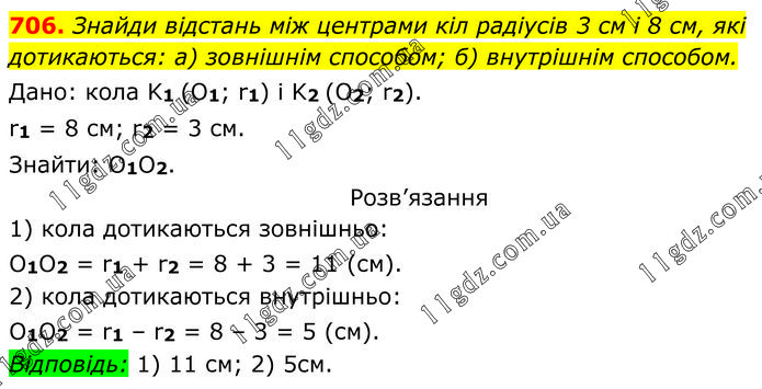 Знайди відстань між центрами кіл радіусів 3 см і 8 см, які дотикаються: а) зовнішнім способом; б) внутрішнім способом. Дано: кола K1 (O1; r1) i K2 (O2; r2). r1 = 8 см; r2 = 3 cм. Знайти: О1О2. Розв’язання 1) кола дотикаються зовнішньо: O1O2 = r1 + r2 = 8 + 3 = 11 (см). 2) кола дотикаються внутрішньо: O1O2 = r1 – r2 = 8 – 3 = 5 (см). Відповідь: 1) 11 см; 2) 5 см.