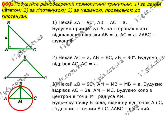 Побудуйте рівнобедрений прямокутний трикутник: 1) за даним катетом; 2) за гіпотенузою; 3) за медіаною, проведеною до гіпотенузи. 1) Нехай ∠А = 90°, АВ = АС = а. Будуємо прямий кут А, на сторонах якого відкладаємо відрізки АВ = а, АС = а. ∆АВС – шуканий. 2) Нехай АС = а, АВ = ВС, ∠В = 90°. Будуємо відрізок АС, АС = а. 3) Нехай ∠В = 90°, АМ = МВ = МВ = а. Будуємо відрізок АС = 2а. АМ = МС. Будуємо коло з центром в точці М і радіуса АМ. Будь–яку точку В кола, відмінну від точок А і С, з’єднаємо з точами А і С. ∆АВС – шуканий.