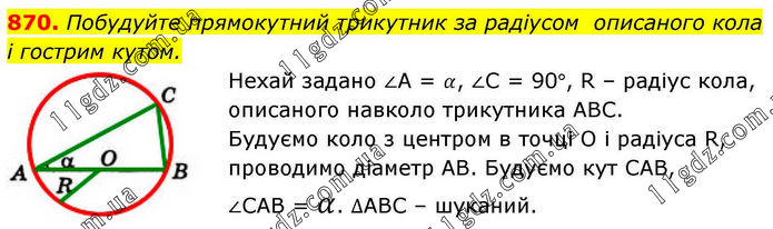 Побудуйте прямокутний трикутник за радіусом описаного кола і гострим кутом. Нехай задано ∠А = α, ∠С = 90°, R – радіус кола, описаного навколо трикутника АВС. Будуємо коло з центром в точці О і радіуса R, проводимо діаметр АВ. Будуємо кут САВ, ∠САВ = α. ∆АВС – шуканий.