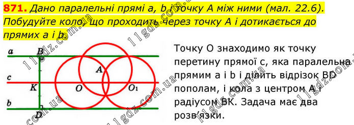 Дано паралельні прямі а, b і точку А між ними (мал. 22.6). Побудуйте коло, що проходить через точку А і дотикається до прямих а і b. Точку О знаходимо як точку перетину прямої с, яка паралельна прямим а і b і ділить відрізок BD пополам, і кола з центром А і радіусом ВК. Задача має два розв’язки.
